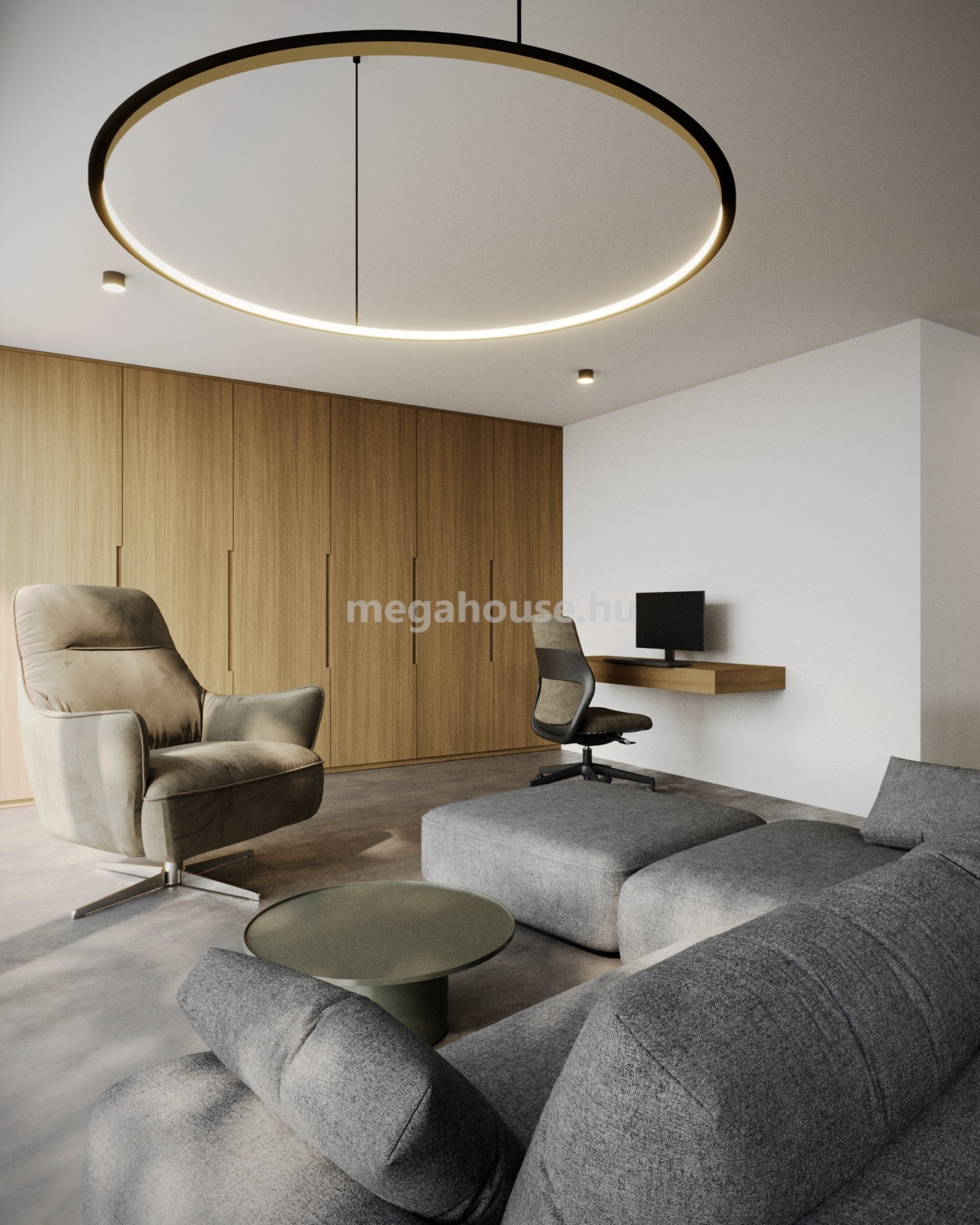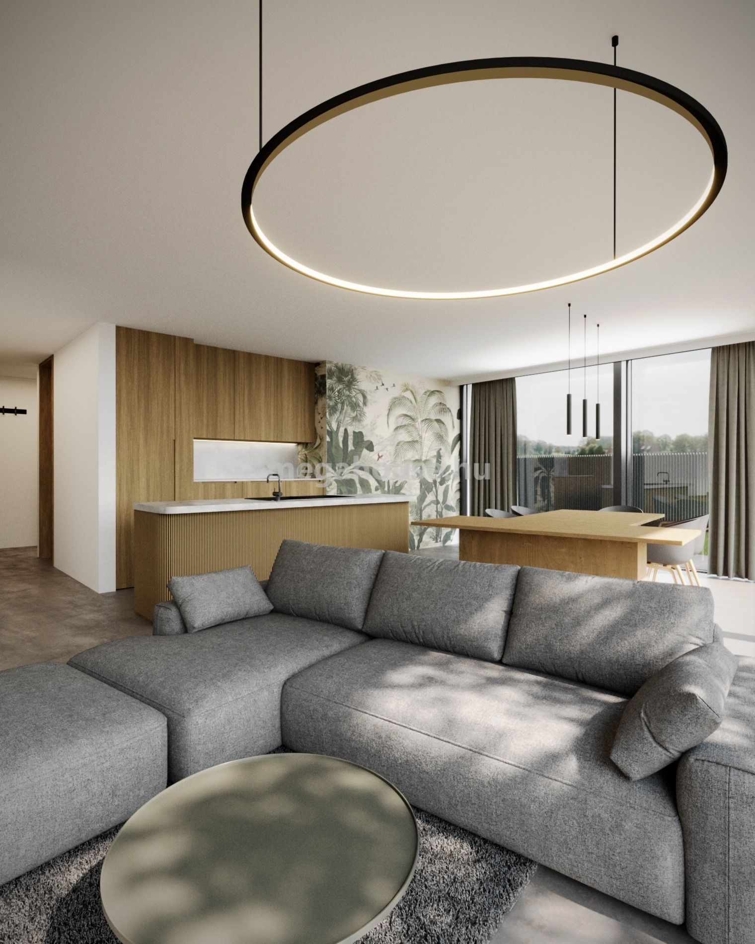 FÖLDSZINT ( 108 nm ) : Tágas amerikai konyhás nappali–étkezővel, külön mosdóval, valamint a gardróbot és külön mellékhelyiséget magába foglaló hálószoba ( 22 nm ) kialakítással.