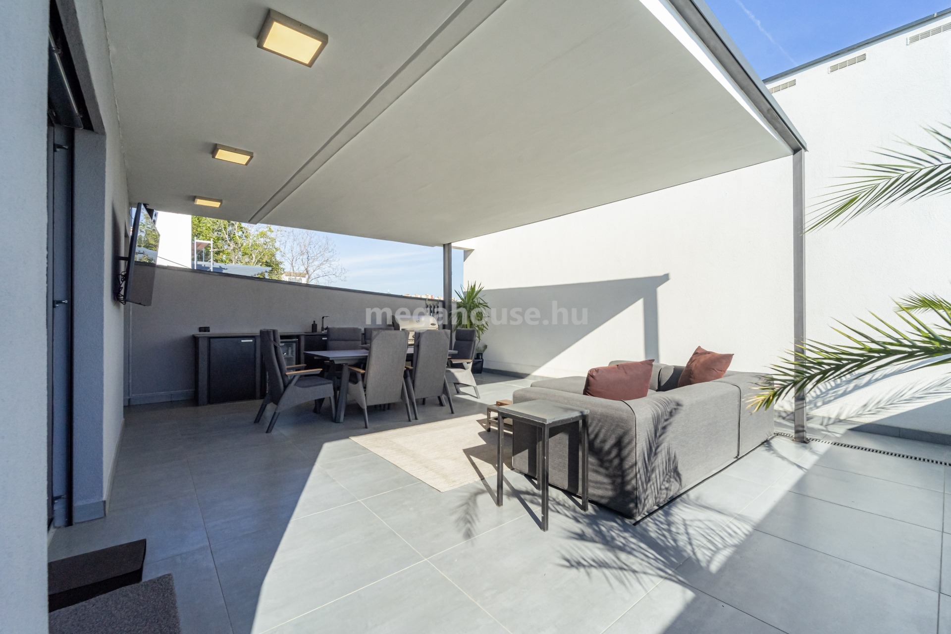 A nappalihoz kapcsolódó, 52 nm-es terasz grill konyhával beépített, nagyrészt fedett, Denon hangrendszerrel kiépített, csakúgy, mint a nappali. Az itt helyet kapott nyári konyha gránit munkalappal, hűtővel, bárpulttal, TV-vel és Santos gáz grillel felszerelt.