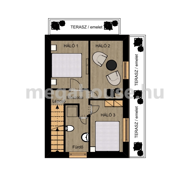 A ház emeletén három, kényelmes hálószobát és egy kádas fürdőszobát találunk. Két hálószobájához kapcsolódik egy üvegkorlátos, 12 nm-es erkély, melyről csodás panoráma tárul elénk.