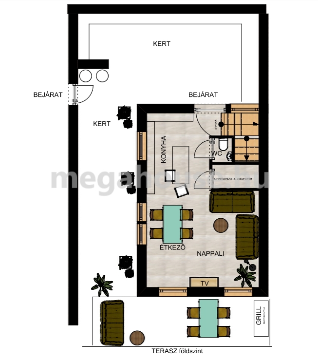 Az épület alaprajza jól átgondolt. Az előtérből az 52 nm-es, majdnem egészében fedett terasszal rendelkező, amerikai konyhás/étkezős nappalba jutunk. Szintén az előtérből nyílik egy praktikus gardrób/mosókonyha helyiség és egy vendég mosdó.
