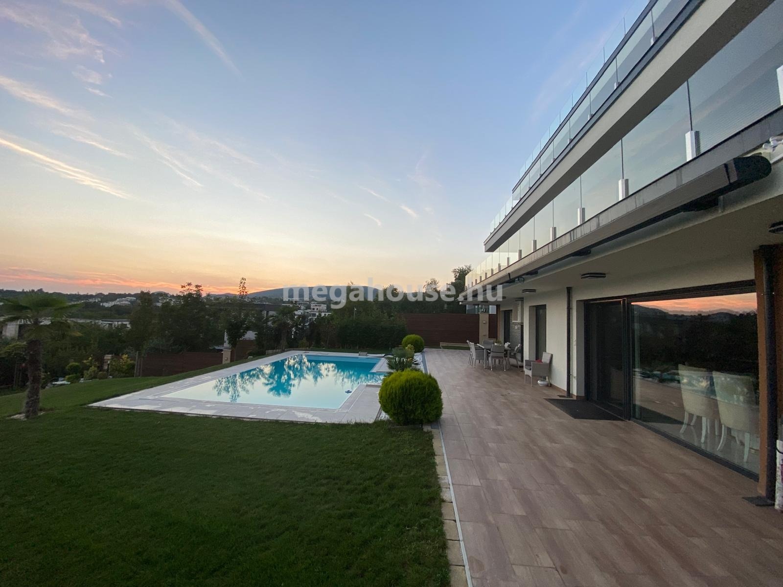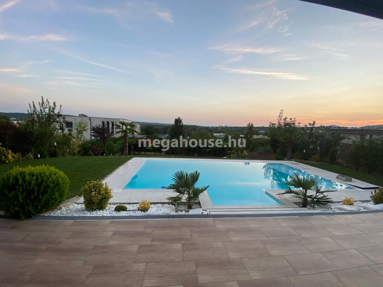 A tágas amerikai konyhás nappali 41 nm-es. Innen a részben fedett teraszra léphetünk ki, majd a csodálatos élményt nyujtó medencébe. A kert pázsitja hibátlan és különleges trópusi-egzotikus növényekkel van körbeültetve. Igazi élmény itt a pihenés, mert a domboldali felvés miatt a földszint is panorámás. A csodás naplementék mindennapi élmény itt.