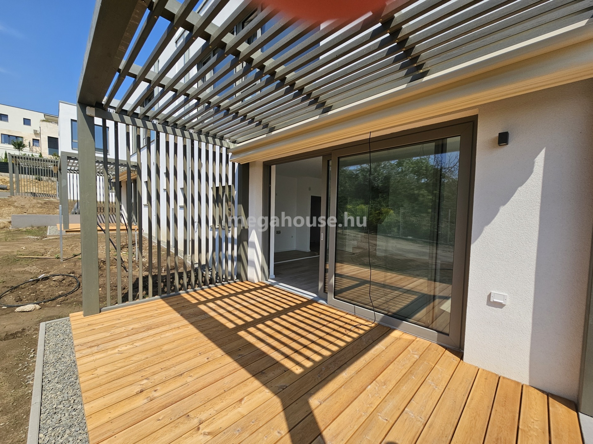 -Teraszon motorosan vezérelhető árnyékoló pergolával