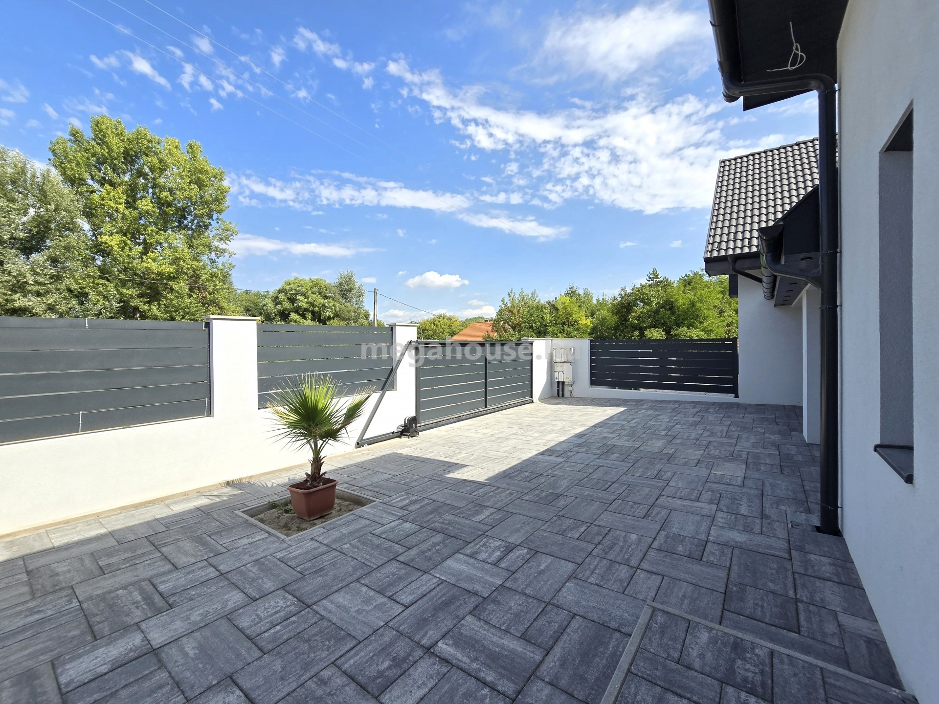 -tereprendezés, kerítésen belüli térkövezés, locsolórendszer, füvesítés – plusz a külső utcafronton is füvesítés, és locsolórendszer